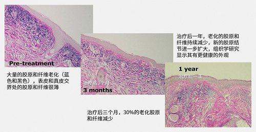 一次高能量(3,5J)治療后即可見完整的表皮出現(xiàn)基底細(xì)胞層空泡化。4天后可見一線狀裂隙,其深度與治療的脈沖能量有關(guān),將脫落的表皮和真皮殘余與新形成的角成和新生的表皮和上層真皮分開。上方的表皮和真皮殘余保持完整而起生物敷料的作用。10天后表皮完全再生,熱改變帶乳頭層和網(wǎng)狀淺層可見大量纖維增生,1年后仍繼續(xù)可見膠原生成。