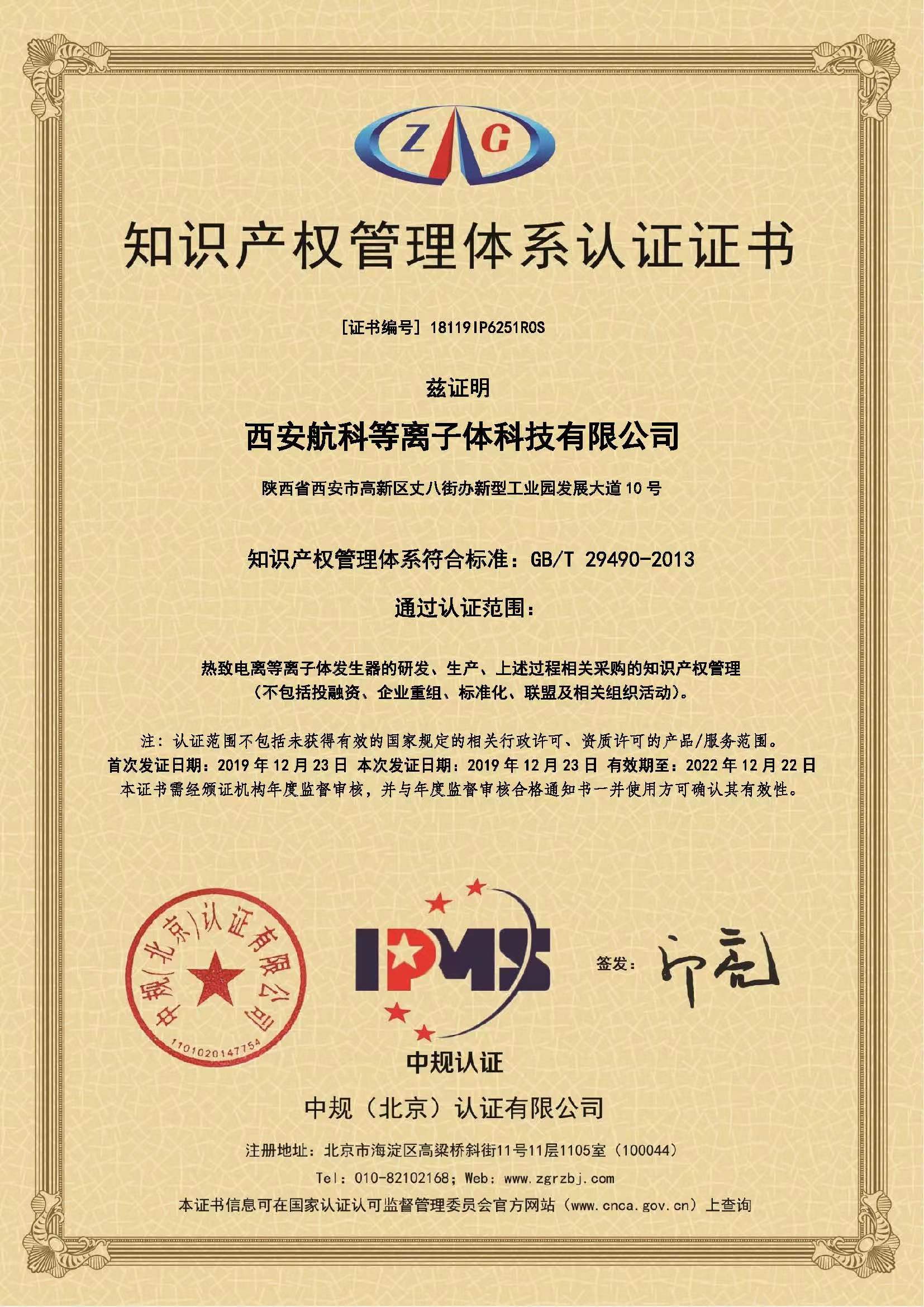 近日,西安航科等離子體科技有限公司順利通過中規(guī)(北京)認證公司進行的國家GB/T 29490-2013體系認證現(xiàn)場審核。