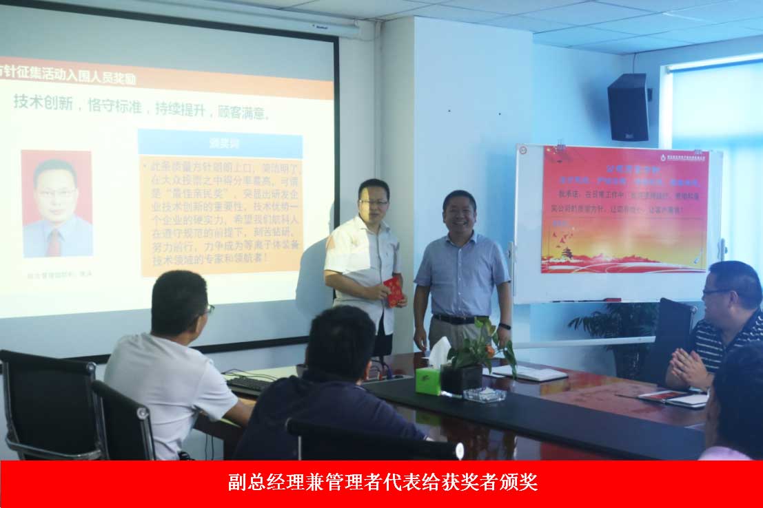 發(fā)布會(huì)上,公司對(duì)本次質(zhì)量方針征集活動(dòng)6名入圍人員進(jìn)行了嘉獎(jiǎng),副總經(jīng)理兼管理者代表?xiàng)罾h給獲獎(jiǎng)人員進(jìn)行了頒獎(jiǎng),鼓勵(lì)全體員工積極參與質(zhì)量管理活動(dòng),從自身崗位出發(fā),為質(zhì)量體系的運(yùn)行做出貢獻(xiàn)。