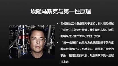 特斯拉的創(chuàng)始人埃隆·馬斯克。馬斯克在很多領域進行了非常多顛覆性的創(chuàng)新,所以很多人問過馬斯克,你為什么能夠做這么多的創(chuàng)新?他的解釋是:“我是用第一性原理來思考這些問題的?!?br />