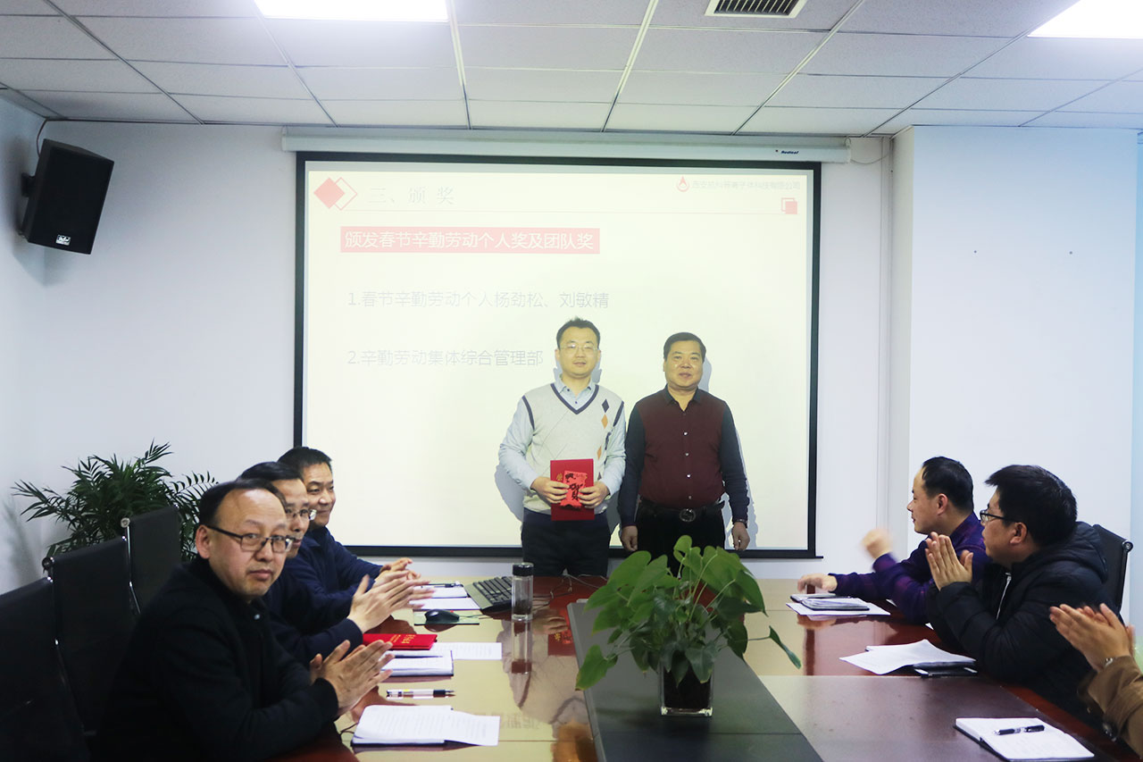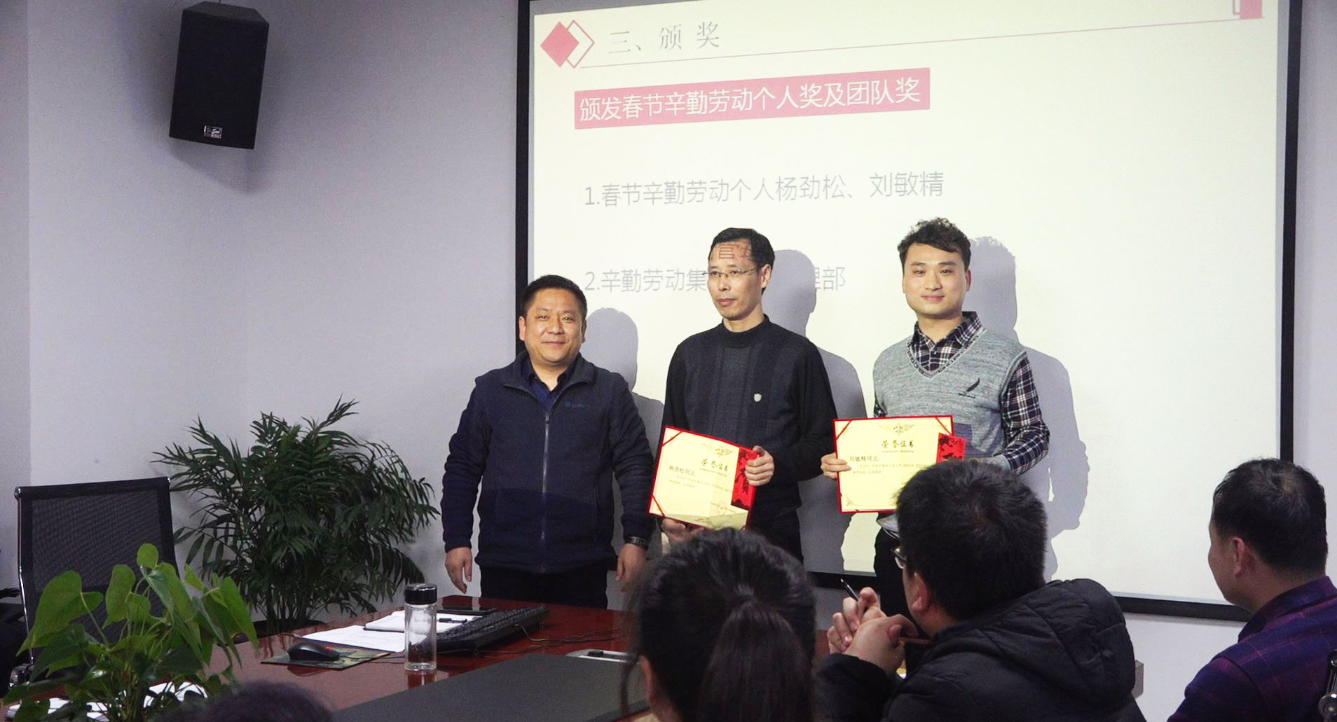 再次,公司對春節(jié)期間仍在崗工作和學(xué)習(xí)的研發(fā)部04項目總師楊勁松、綜合管理部人資主管劉敏精和辛勤勞動集體予以表彰,副總經(jīng)理楊利鋒給個人頒發(fā)榮譽證書和獎金。公司領(lǐng)導(dǎo)對綜合管理部予以表彰,表揚綜合管理部一直兢兢業(yè)業(yè)的為大家服務(wù),配合項目工作,評為辛勤勞動集體;